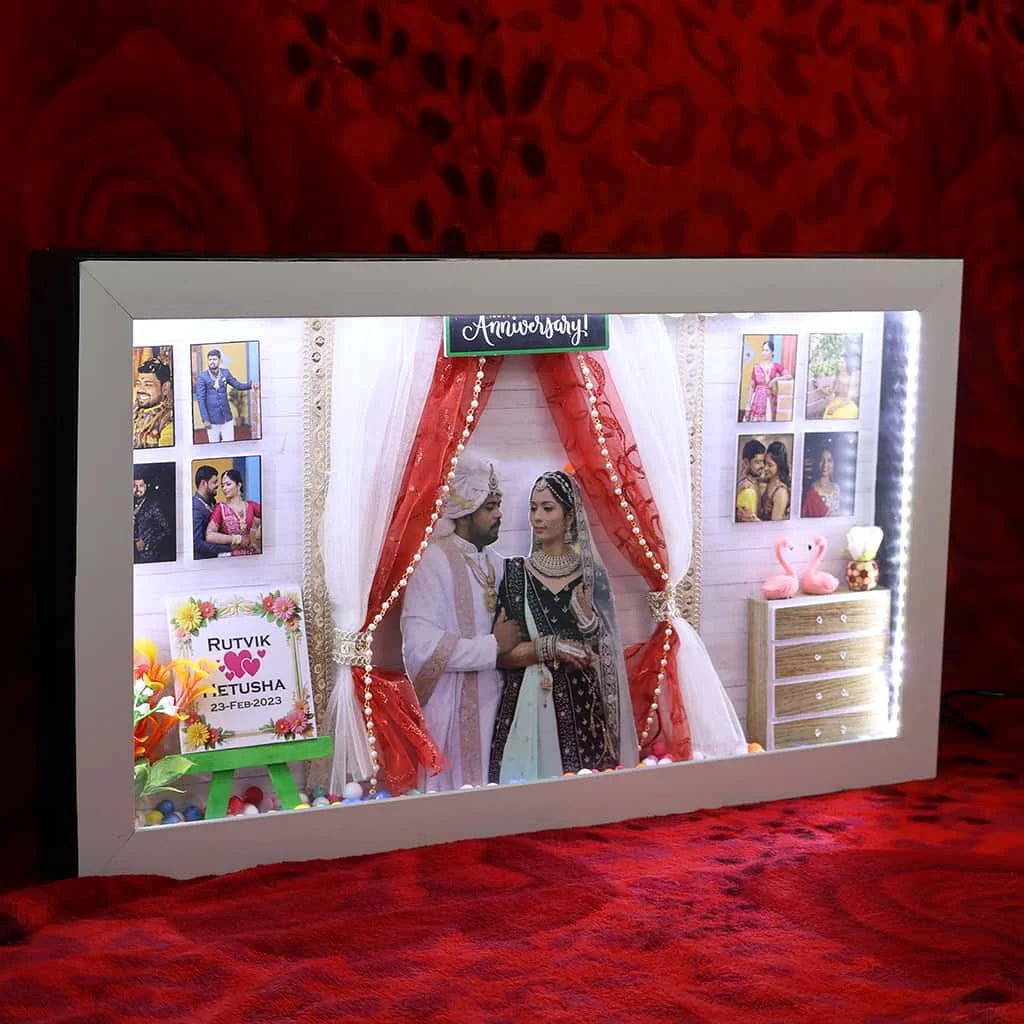Customize the surname to your preference, making it a unique and meaningful addition to your home decor. The miniature is adorned with six photos, allowing you to showcase your cherished memories in a whimsical and captivating manner. Additionally, a cute little couple miniature adds an extra layer of sweetness to the scene.